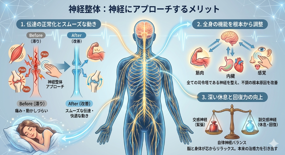 「神経整体」は、体の表面ではなく、深部の司令塔に働きかけることで、あなたの自然な回復力を引き出す新しいタイプのアプローチです。